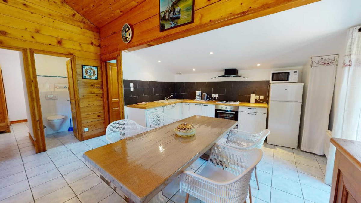 Gite a l’étage: Le gîte bénéficie d’une grande pièce à vivre avec son poêle à bois et sa cuisine ouverte, 2 chambres : la première avec 1 lit double 140cm et la seconde 2 lits simples 90cm. Une salle d’eau avec un WC plus un WC séparé, chauffage électrique.