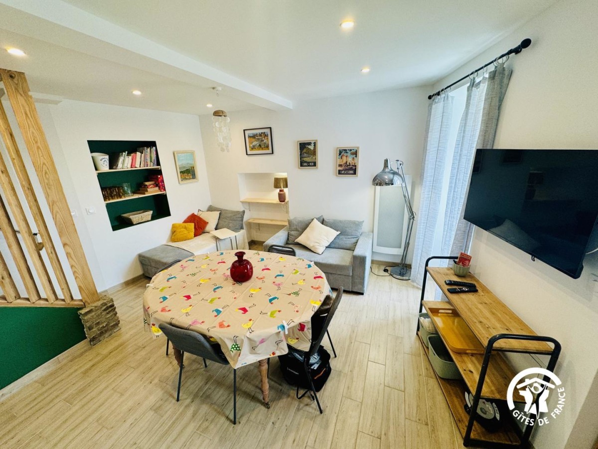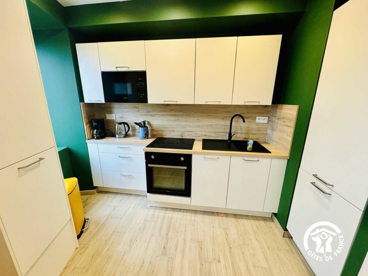 – Un séjour avec coin salon (TV, deux canapés) et cuisine ouverte toute équipée (lave-vaisselle, four, micro-ondes, frigo-congélateur, cafetière à filtre) avec une table à manger.