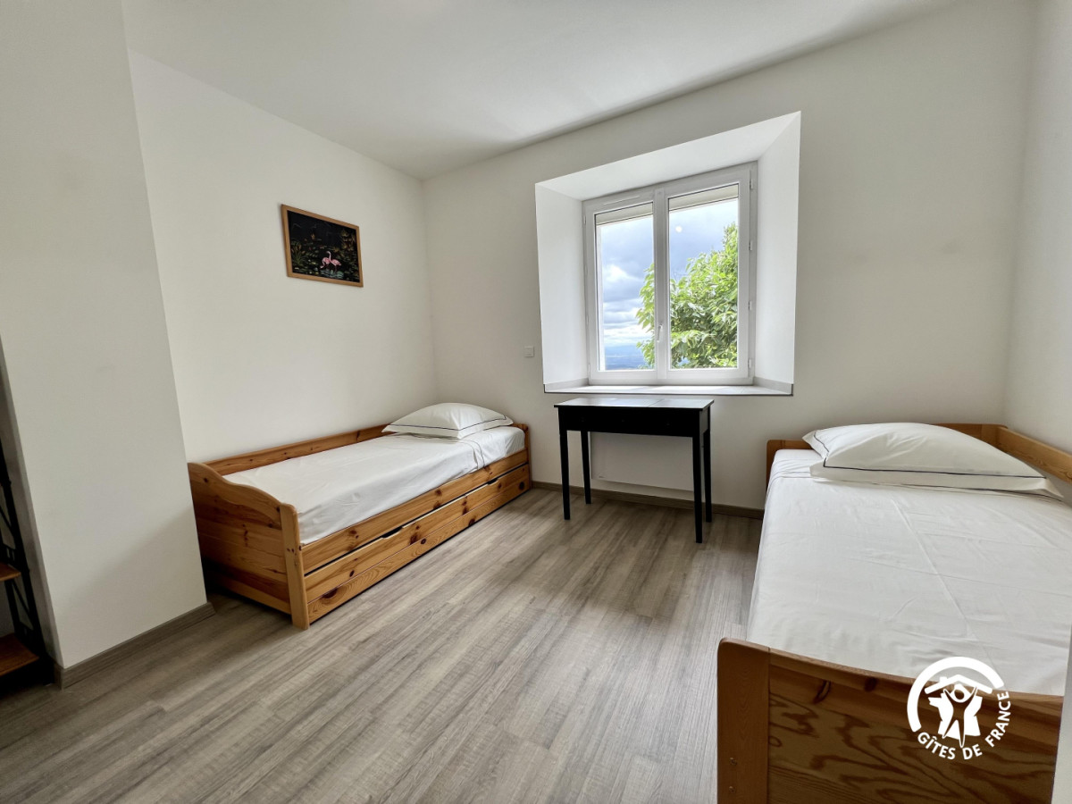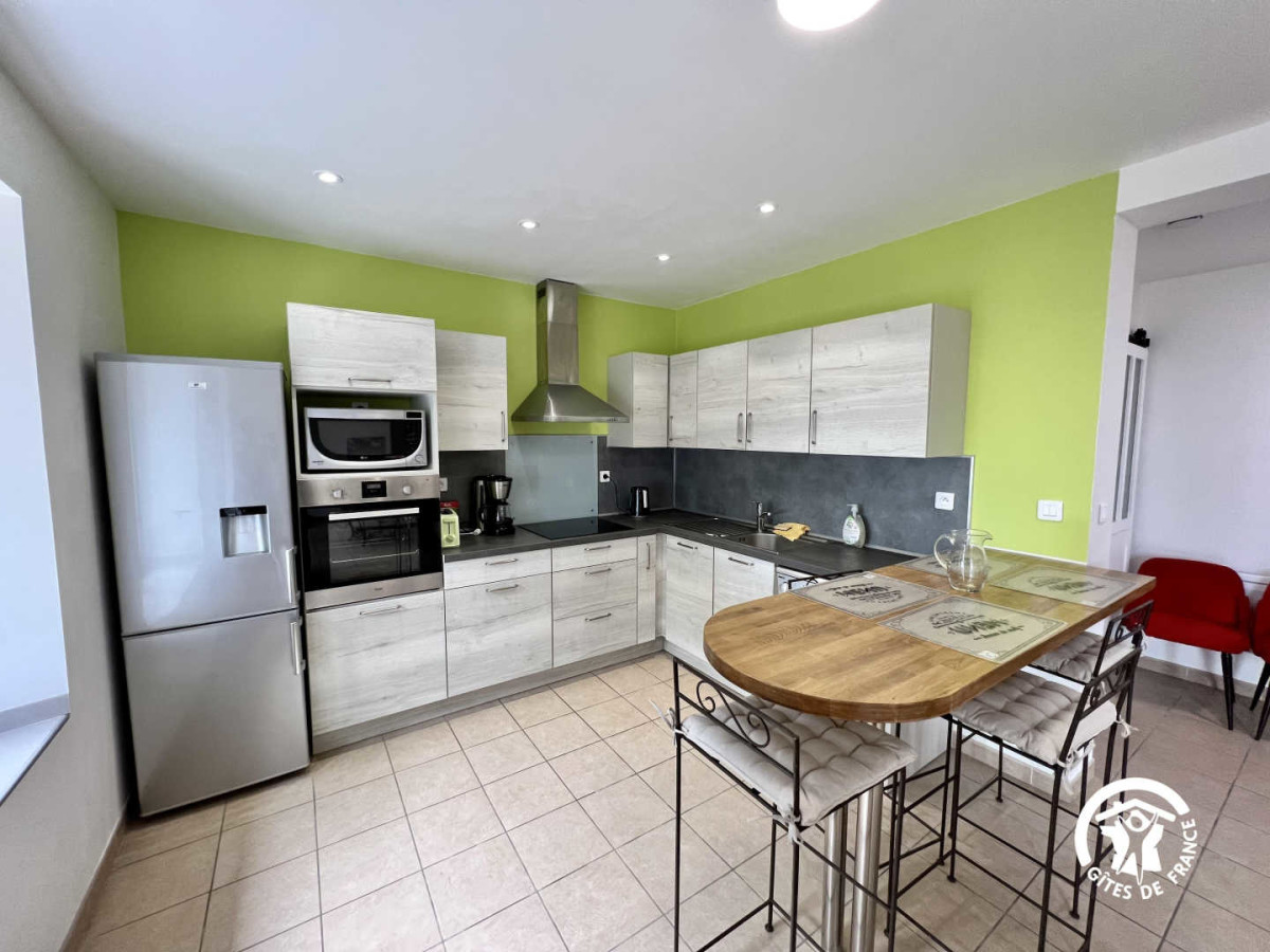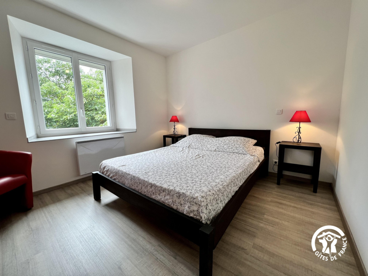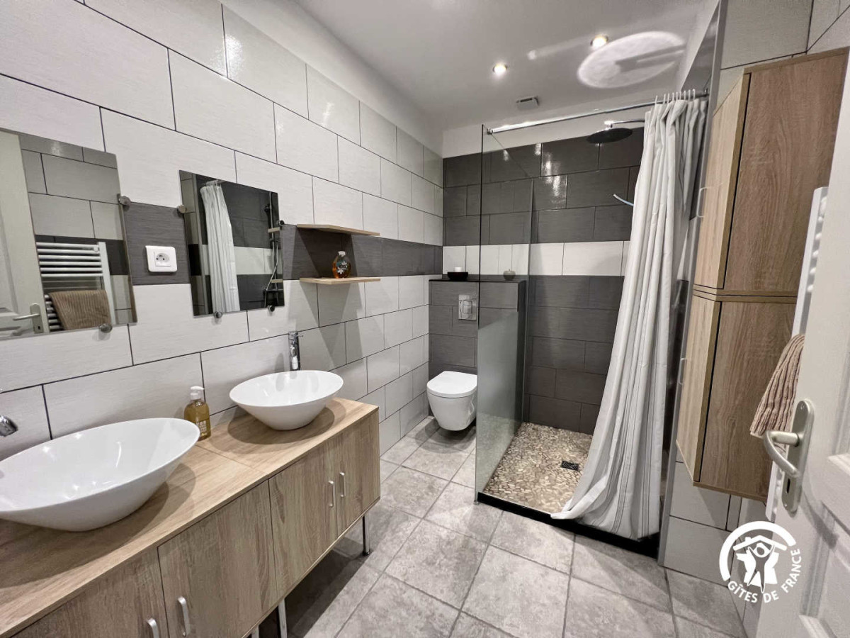 Le Gîte comprend un séjour cuisine, donnant sur la terrasse avec salon de jardin et barbecue, une salle d’eau avec WC. A l’étage: une chambre avec 1 lit en 160, une chambre avec 2 lits en 90. Une deuxième salle d’eau avec WC. Grande terrasse privative en devant de porte, parking sur la propriété.