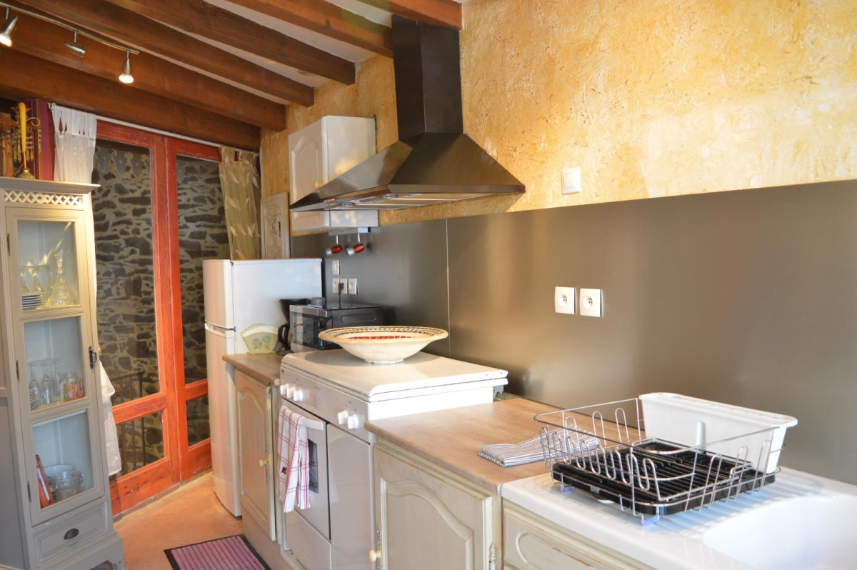 Le gîte s’organise de manière fonctionnelle : au rez-de-chaussée, vous disposez d’une cuisine indépendante adaptée à des séjours de courte ou longue durée. L’espace séjour-salon, lumineux, vous permet de vous retrouver en toute convivialité grâce à un coin détente aménagé autour de la télévision.