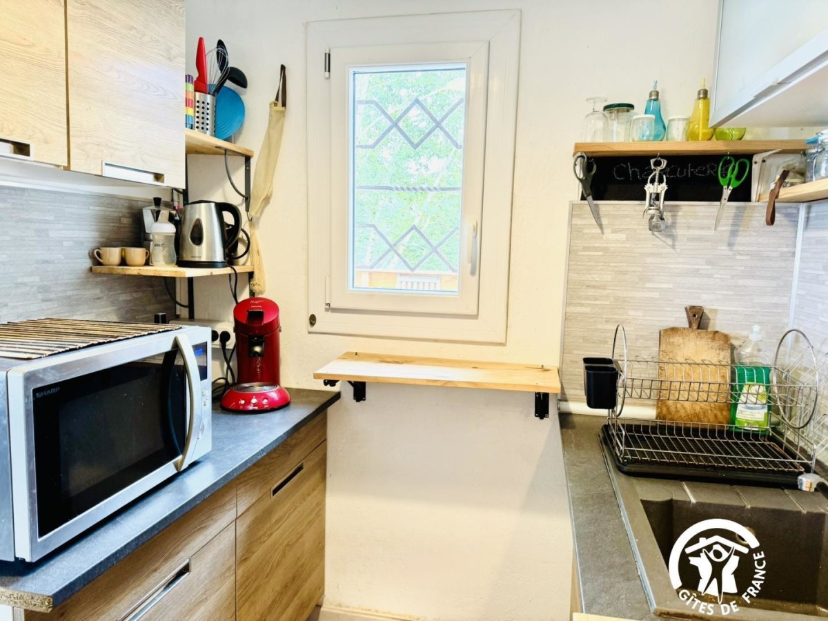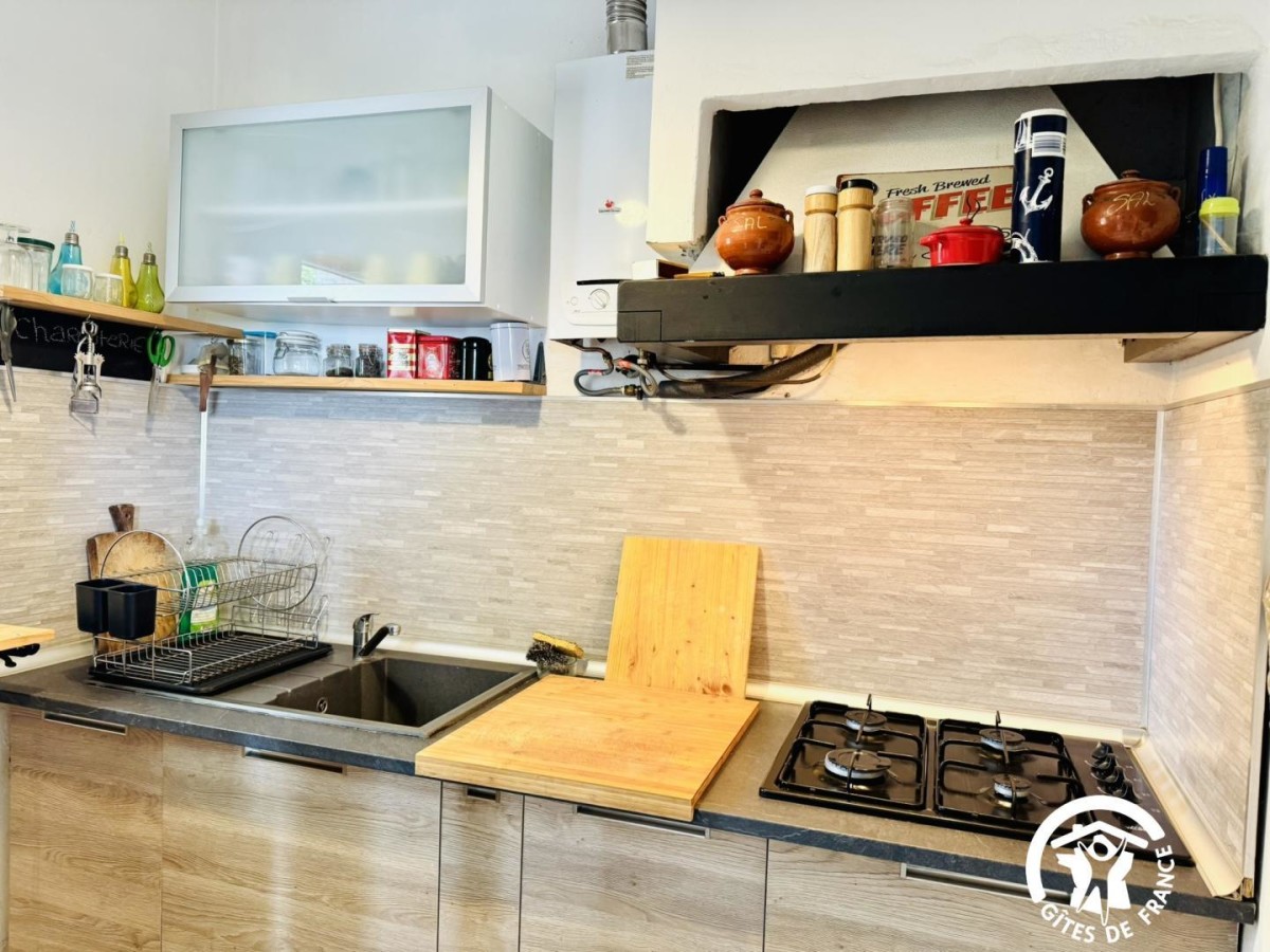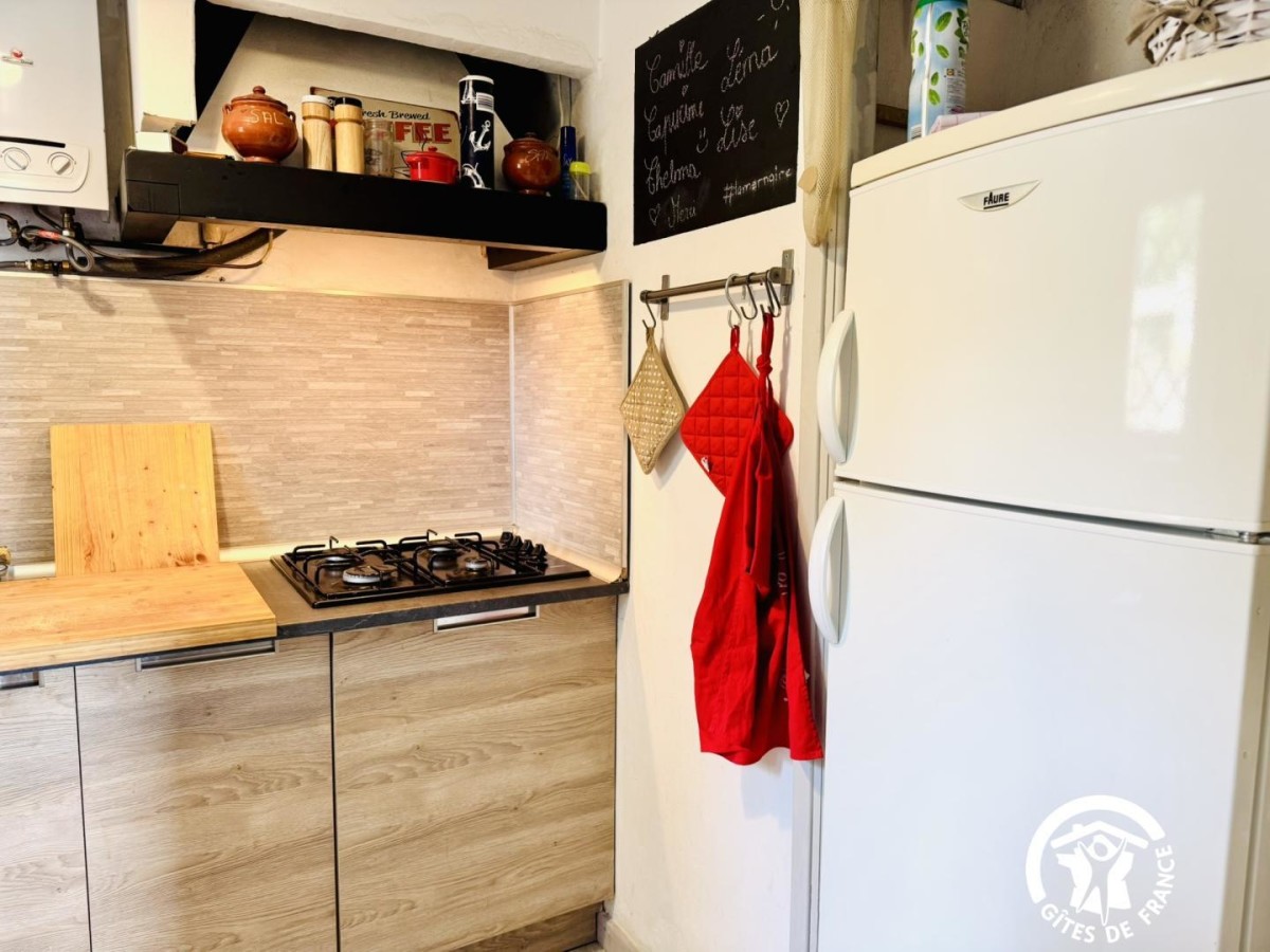 _Une cuisine avec plaque gaz, mini-four combiné, réfrigérateur avec compartiment congélateur, cafetière dosettes Senseo,