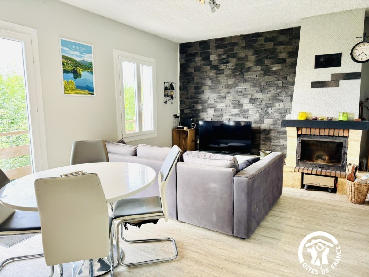 _Une séjour avec téléviseur, une cheminée avec bois fourni, le tout ouvert sur une terrasse surélevée,